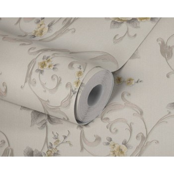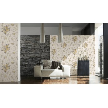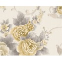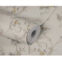 Winylowa tapeta wyprodukowana na flizelinie, z oryginalnym motywem, który przedstawia różane bukiety otoczone drobnymi kwiatkami ogrodowymi i roślinnymi ornamentami. Kolorystykę wzoru o wyraźnie podkreślonych konturach stanowią odcienie szarości, beżu i złota, natomiast jednobarwne tło jest kremowobiałe. Aplikacje mają niejednolitą strukturę, na ich powierzchni widać cienkie prążki, tłoczone w kilku kierunkach. Wszystkie florystyczne elementy subtelnie mienią się drobinkami złocistego brokatu. Półmatowe, nieco szorstkie w dotyku tło imituję fakturę rypsowej tkaniny. Tapeta dobrze komponuje się z jednobarwnym tłem w kolorze złota lub jasnej szarości. Pasuje m.in. do sypialni, salonu, przedpokoju czy jadalni.